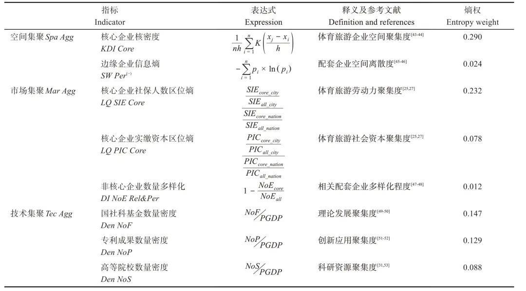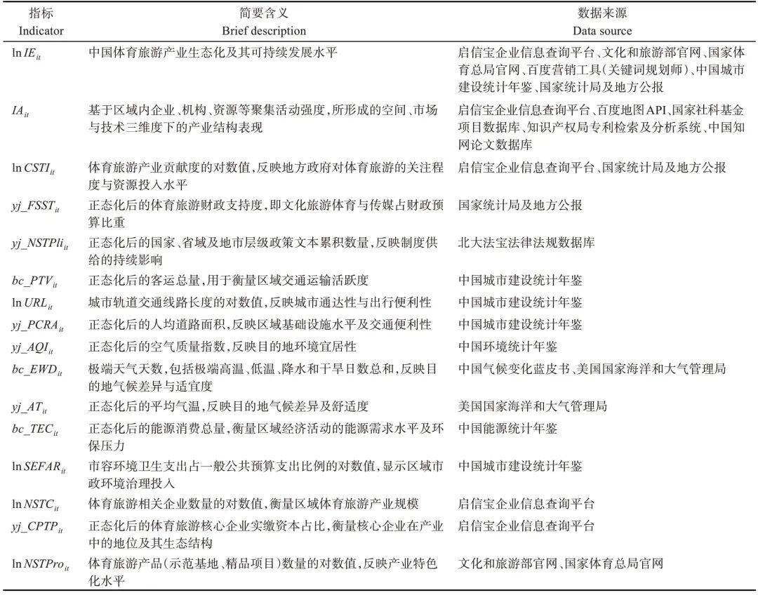 核心解释变量为产业集聚,即体育旅游相关企业、机构和资源在特定区域内的集聚程度。将其操作化为3个维度:空间集聚、市场集聚和技术集聚,并依据熵值法计算不同维度线性加权总和以表征整体集聚水平。初始数据包括体育旅游企业数量、社保参保人数、实缴资本及其经纬度,国家社会科学基金项目数量,体育旅游相关专利数量,以及体育旅游高等院校数量等关键指标。数据来源涵盖启信宝企业信用信息平台、百度地图应用程序编程接口(application programming interface,API)、国家社会科学基金项目数据库、国家知识产权局专利检索及分析系统、中国知网论文数据库等权威渠道(表3)。
