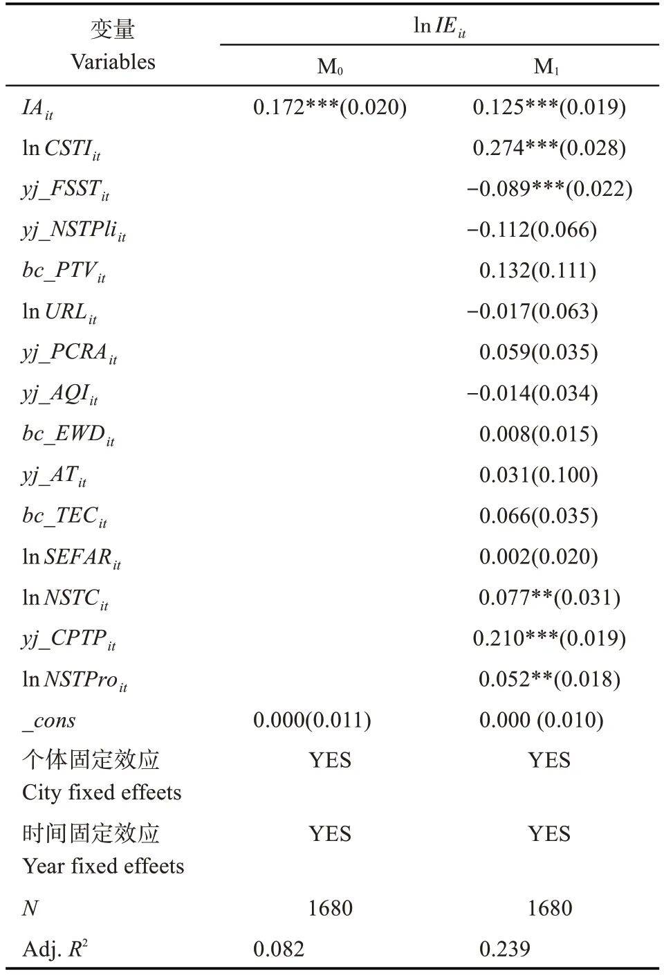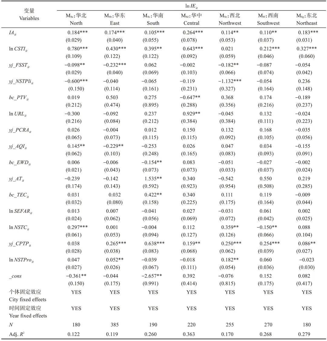 注:***、**和*分别表示在1%、5%和10%的水平上显著;数值为标准化回归系数,括号内为稳健标准误。lnIEit指产业能值的自然对数值;IAit指产业集聚;lnCSTIit指体育旅游产业贡献度的自然对数值;yj_FSSTit指经Yeo-Johnson 正态化处理后的体育旅游财政支持度;yj_NSTPliit指正态化处理后的累积政策数量;bc_PTVit指经Box-Cox 正态化处理后的客运总量;lnURLit指城市轨道交通建成线路长度的自然对数值;yj_PCRAit指正态化处理后的人均道路面积;yj_AQIit指正态化处理后的空气质量指数;bc_EWDit指正态化处理后的极端天气天数;yj_ATit指正态化处理后的平均气温;bc_TECit指正态化处理后的能源消费总量;lnSEFARit指市容卫生支出占固定资产投资比重的自然对数值;lnNSTCit指累积体育旅游相关企业数量的自然对数值;yj_CPTPit指正态化处理后的核心企业实缴资本占比;lnNSTProit指体育旅游产品数量的自然对数值。