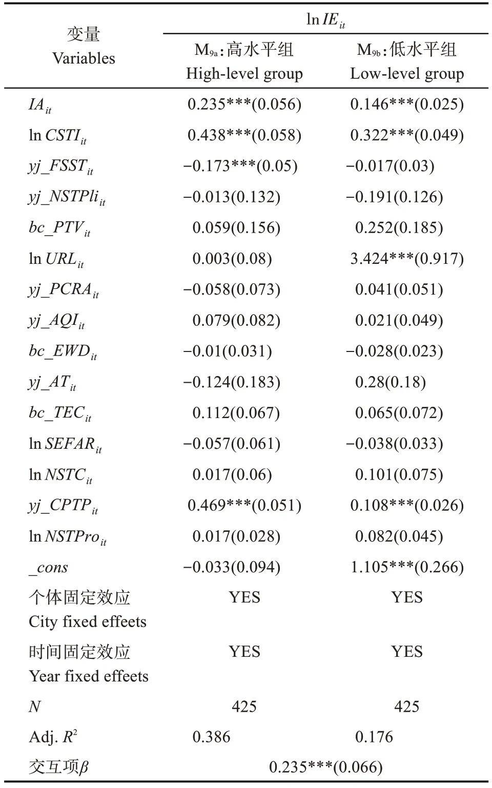 注:***、**和*分别表示在1%、5%和10%水平上显著;数值为标准化系数,括号内为稳健标准误;交互项β指产业集聚×分组变量(经济发展水平)的标准化回归系数。
