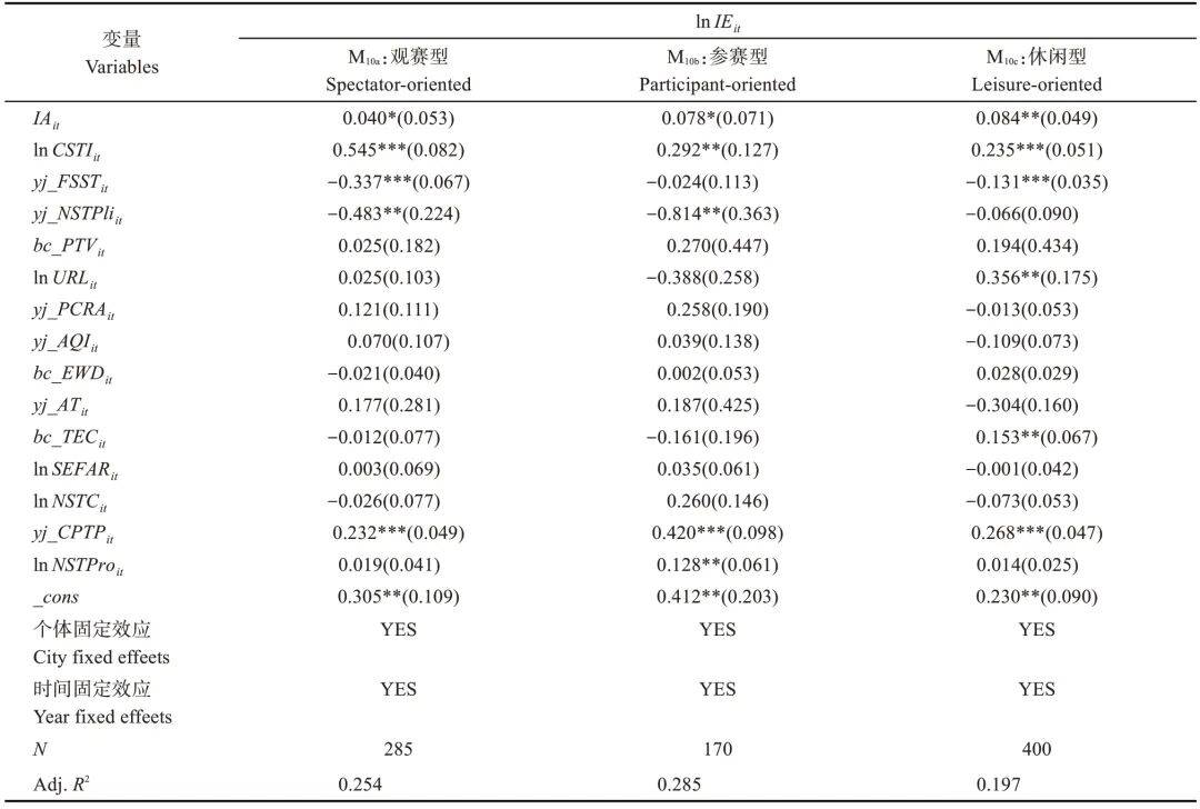 注:*表示在10%的水平上显著;①表示基于观赛型体育旅游城市数据样本,②为参赛型,③为休闲型;为避免群组样本线性等问题的干扰,控制变量调整为:bc_EWDit,即正态化极端天气天数;lnSEFARit,即市容卫生支出占固定资产投资比重的自然对数值;lnNSTCit指累积体育旅游相关企业数量的自然对数值;yj_CPTPit指正态化核心企业实缴资本占比;lnNSTProit指体育旅游产品数量的自然对数值。