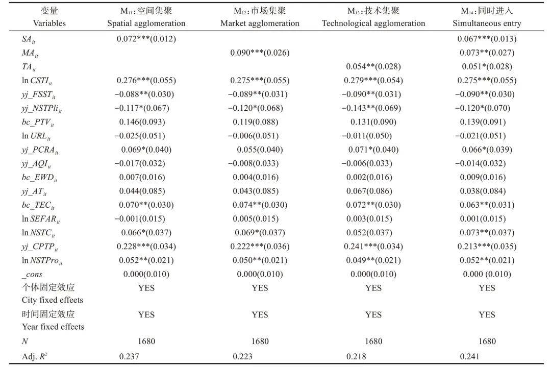 注:***、**和*分别表示在1%、5%和10%的水平上显著;数值为标准化回归系数,括号内为稳健标准误。SAit表示空间集聚;MAit表示空间集聚;TAit表示空间集聚。