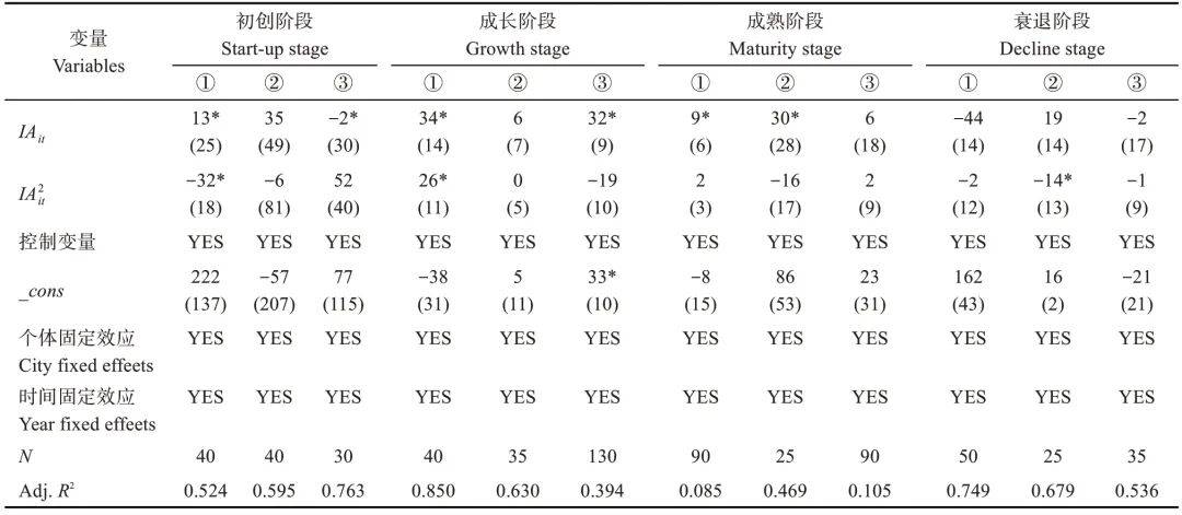 模型设定方面,本研究使用二次项模型而非Hansen提出的门槛回归模型(简称“H模型”)[67],原因包括:1)理论预设体育旅游产业集聚与能值之间呈倒U形关系,更符合连续变化的逻辑;2)当前数据为2019—2023年的短面板,H模型要求的大样本及样本分割检验条件难以满足;3)研究框架中涉及多维集聚、交互效应等多组模型,二次项模型在拓展性与结构整合方面更具优势。随后根据企业寿命与资本占比,划分不同阶段:初创、成长、成熟和衰退阶段,分别构建了包含一次项和二次项的模型,检验二次项在异质性群组中的影响。结果表明:1)初创与成长阶段,产业集聚对能值有正向影响,二次项无显著性;2)成熟阶段,二次项系数为负,开始出现倒U形演化趋势;3)衰退阶段,二次项系数显著负向,进一步验证了倒U形关系。模型调整后R2均大于0.2,表明模型具备良好的拟合优度,且F检验表明二次项模型在衰退阶段更具解释力。