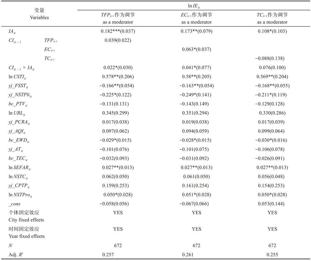 注:***、**和*分别表示在1%、5%和10%的水平上显著;数值为标准化回归系数,括号内为稳健标准误。TFPit-1指全要素生产率;ECit-1指技术效率;TCit-1指技术进步;CIit-1×IAit指交互项,不同模型中分别指代TFPit-1、ECit-1和TCit-1与IAit的乘积。