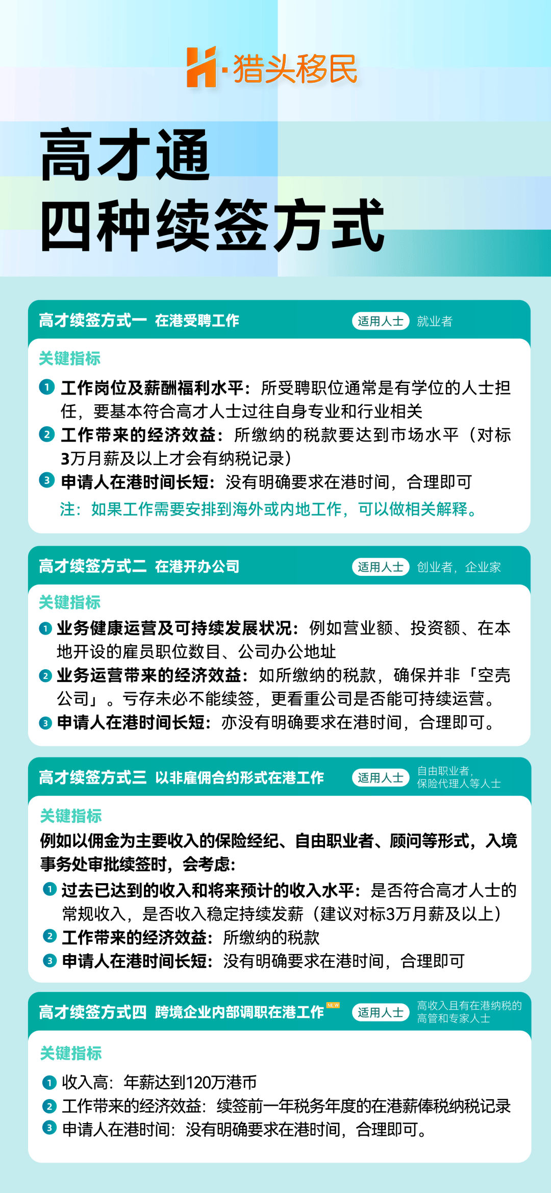 高才通计划的续签要求明确绑定申请人在香港的工作状态,不仅要求申请人必须在香港工作,还规定薪资水平不得低于市场平均水平,续签时需提供雇主公司的相关资料进行审核。因此,如果你已有明确的在香港工作、创业或开设公司的规划,高才通计划可能更适合你,同时该计划的审批速度相对较快,能够帮助你快速获取香港身份。