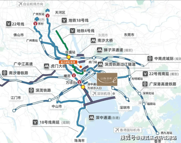 山海合悦坐落于南沙先行启动区的南沙湾板块,这里是南沙最早开发、配套最成熟的区域之一,亦是未来城市封面级滨海生活示范区。项目距离地铁4号线号线号线三线交汇的南沙客运港站仅约900米,步行可达。其中,22号线作为湾区“大动脉”,设计时速高达160公里,已开通首段,未来可实现30分钟直达广州中心城区,2站即可换乘深圳地铁,真正实现广深莞“半小时生活圈”。