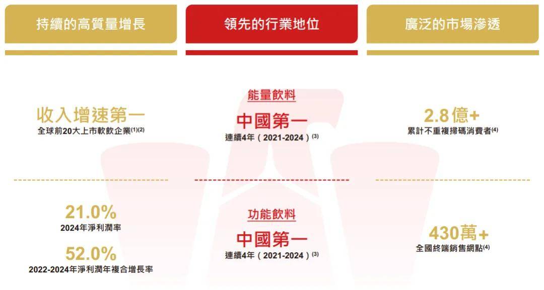 截至2025年9月30日,以累计不重复扫码计,东鹏饮料已与超过2.8亿消费者进行连接,和超过430万终端销售网点高效互动,同超过3,200个经销伙伴深度合作,提升了整体业务竞争力。