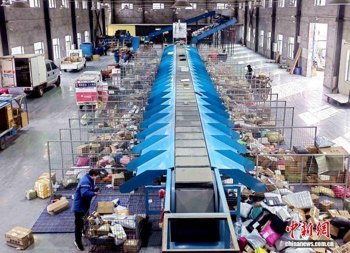 民勤电商物流产业园内,特色年货快件高效集散,实现双向畅通。(资料图)荣小勤 摄