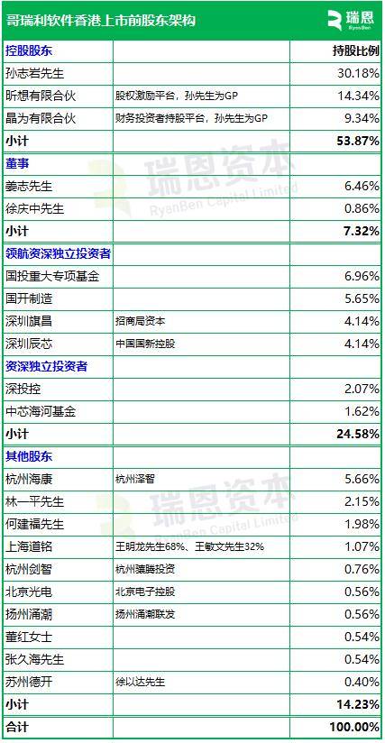 哥瑞利软件在香港上市前的股权架构中,孙志岩先生及其控制的持股平台,合计持股53.87%,为控股股东
